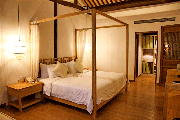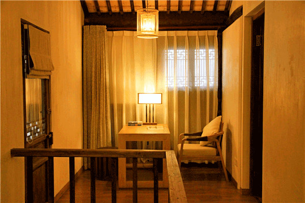 不仅有古典的外观,河上民宿的室内设计也十分精致。中式灯笼、纯木家具、江南水墨壁画,一切是古香古色的。